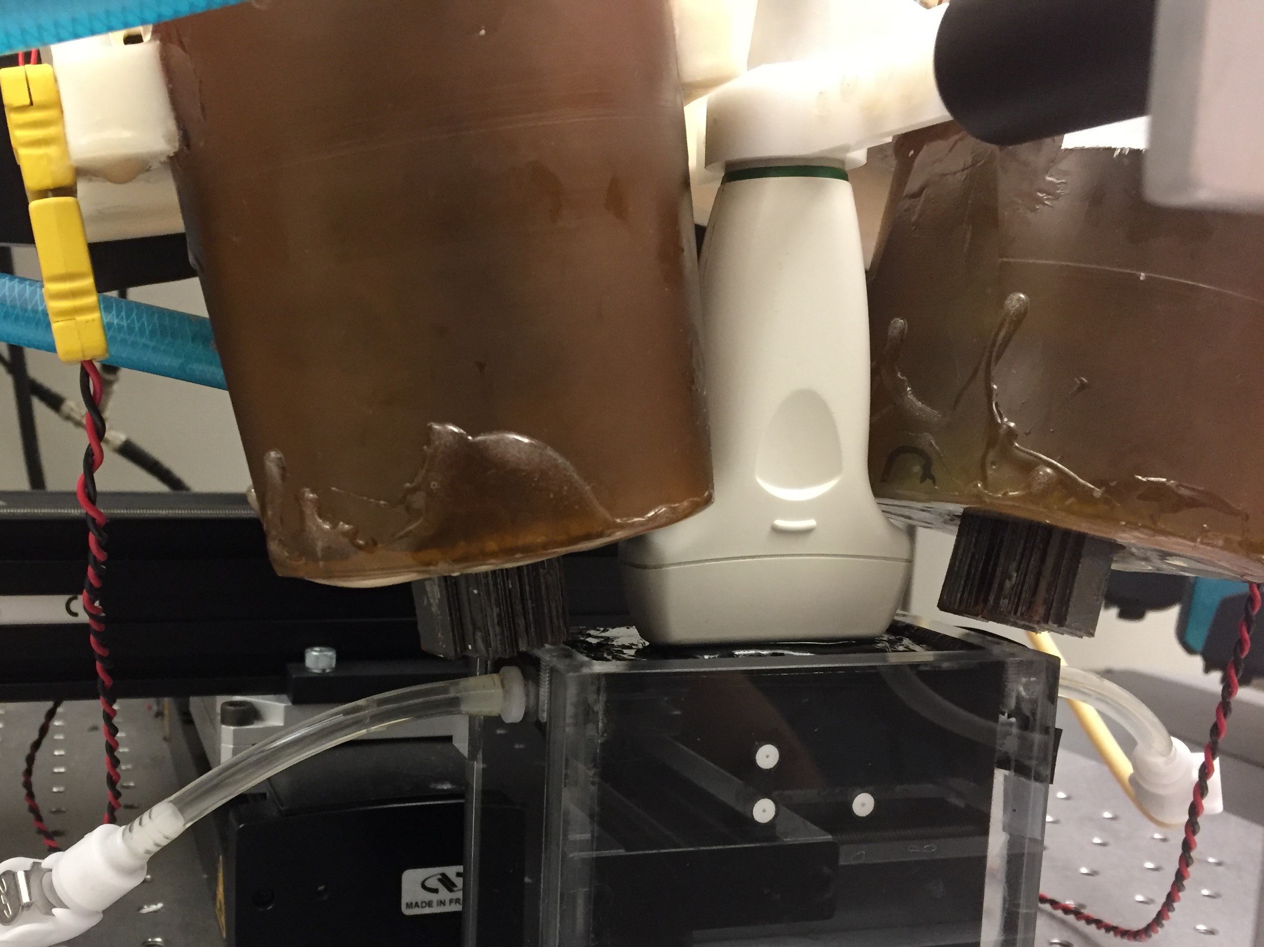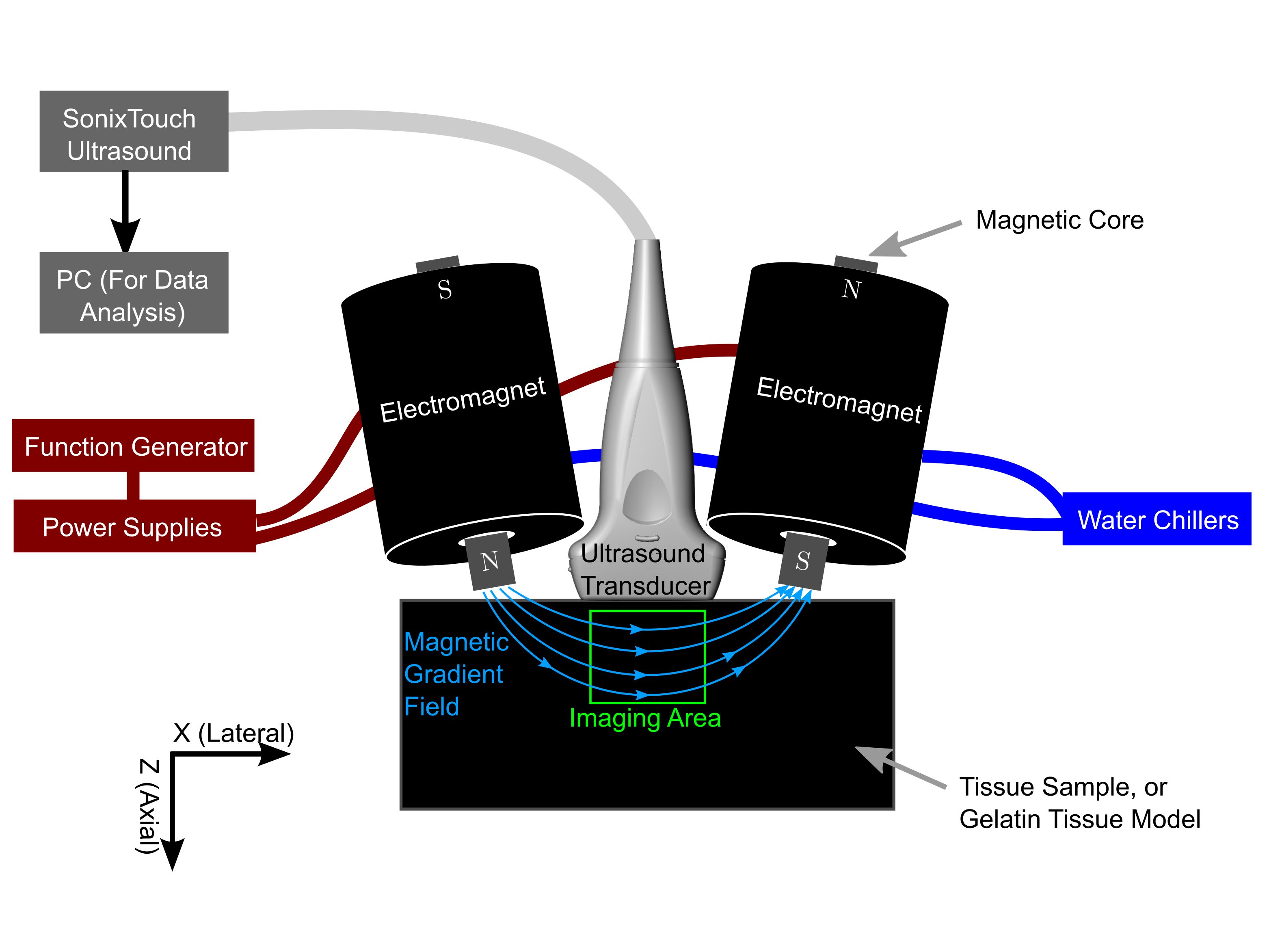 Magnetomotive Ultrasound (MMUS) System: The magnetomotive ultrasound (MMUS) system, pictured in Figure 1 is designed to image areas in tissue or tissue models that have been infused with iron oxide particles. Built around a commercially-available Ultrasonix SonixTouch ultrasound platform with a L14-5/38 linear transducer, the system employs two electromagnets to create a sinusoidal magnetic gradient force in the imaging area. The force causes the portions of the imaging area with iron oxide particles (which are highly-paramagnetic) to oscillate up and down, with a frequency and acoustic phase that matches the magnets’ frequency and phase. Ultrasound RF data is collected for 7.5 seconds, and sent to a computer for analysis. This analysis determines which portions of the image are being displaced at the magnet frequency and phase. For more on how magnetomotive imaging works, see our Magnetomotive Imaging page. For more on the design of this MMUS system see Pope et al, 2013.