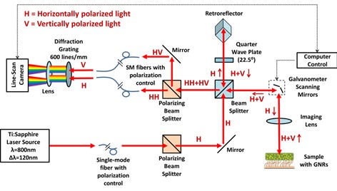 Ultrahigh-resolution, polarization-sensitive, spectral-domain OCT system: The custom-designed spectral domain PS-OCT system shown in Figure 1 uses low coherence interferometry to collect cross-sectional images up to ~2 mm beneath tissue surfaces. The light source for UHR-PS-OCT is a low-coherence 800 nm, 120 nm bandwidth, Ti:Sapphire laser. Because this imaging technique uses LCI, we are able to depth resolve the features beneath the tissue surface using a technique called coherence gating. The wavelength of the near-infrared light source falls into a “biological optical imaging window” since it is minimally absorbed by the different components of tissue (water, melanin, hemoglobin, etc.), allowing for greater tissue penetration depths. The system resolution is ~3 × 10 µm axial × transverse (Chhetri et al, 2012), which is significantly greater than many conventionally used OCT systems, whose resolutions are ~10’s of microns.