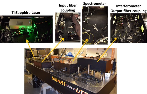 This ultra-high resolution allows us to study micron-scale features in tissue, which is valuable for investigating respiratory disease, breast cancer, and dentistry. Since we are using an interferometric based system, we can monitor changes in the phase of light recorded, which gives us nano-scale sensitivity to movements within tissue, and has been used to develop new techniques to monitor the movement of nanoparticles introduced into tissue, like magnetomotive OCT to detect magneto-receptors, and diffusion-sensitive OCT to measure the nanoscale porosity of mucus or extracellular matrix. We obtain polarization sensitivity by isolating one polarization state at the input of our imaging system. This gives us the ability to discriminate between scatterers with different optical properties, like gold nanorods used with DS-OCT. This OCT system was custom built by our laboratory, shown in Figure 2, and therefore fully customizable to meet ever-changing needs.
