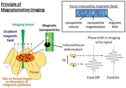 The method for using OCT to detect magnetically labelled samples was first invented by Dr. Oldenburg as a postdoc in Dr. Stephen Boppart's laboratory in 2005 (Oldenburg et al, 2005). This technique was first used in vivo in 2006 to locate iron oxide particles in live tadpoles (Oldenburg et al, 2005). Since then, the technique has been further improved such that MMOCT can be used in more modern, spectral-domain OCT systems (Oldenburg et al, 2008). More recently, the Oldenburg lab demonstrated the ability of MMOCT to distinguish between healthy and injured pig arteries by attaching SPIO’s to platelets (Oldenburg et al, 2010). (Platelets are cells in the body which naturally move to wound sites in order to start the healing process.) For the most recent applications we are working on, please check out the thrombosis imaging page. Also, we have been using magnetomotive techniques for detecting magnetoreceptors in animals.