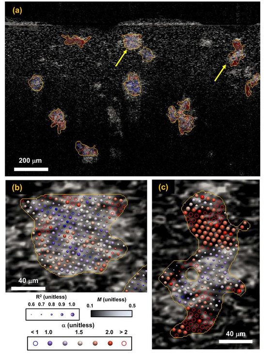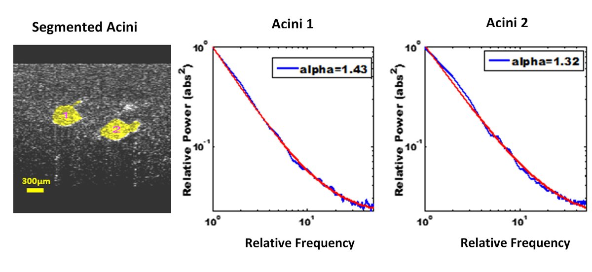 Intracellular Motility Imaging via Inverse Power-Law OCT Fluctuation Spectroscopy: OCT provides both spatial and temporal information relevant to organoid function. In the temporal domain, by computing the speckle fluctuation spectrum from OCT images, we have shown that mammary epithelial organoids exhibit an apparent “motility” arising from in-place intracellular motion. This motility signal can be parameterized by two independent metrics: the inverse power-law exponent (a), and the fractional modulation amplitude (M), which are sensitive to functional cellular changes (Oldenburg et al., 2015; Oldenburg et al., 2013). In the spatial domain, we have shown that the OCT-based morphological features of mammary epithelial organoids (including size, lumen size, and asphericity) are sensitive to culture conditions as related to stromal-epithelial interactions (Chhetri et al., 2012). Taken together, OCT offers a unique platform for noninvasively and longitudinally assessing intracellular motion and morphology of 3D mammary epithelial cell organoids, which may be relevant for studying mechanisms of breast cancer (Yu et al,2018) -- see our application page here.
