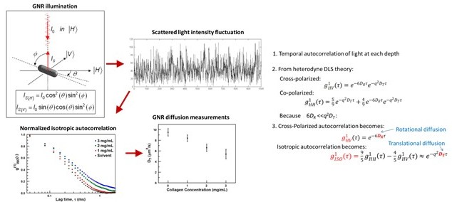 Imaging Nanoporosity using Diffusive Probes and OCT: Our body’s tissue is made up of proteins, primarily collagen, that are linked together to form a spongy mesh. The spacing between the proteins, i.e. the mesh pore sizes, can be used to study and monitor diseases such as breast cancer (Chhetri et al, 2014; Blackmon et al, 2016) and cystic fibrosis (Chhetri et al, 2014; Blackmon et al, 2017). Our laboratory has developed a method to measure these nanoscale pore sizes using gold nanoparticles. Nanoparticles strongly scatter light at the wavelengths used with our system due to a phenomenon is known as plasmon resonance. Instead of employing commonly used spherical particles, we use rod-shaped nanoparticles (GNRs) that have customized longitudinal plasmon resonance tuned to the centered of our OCT system’s wavelength. This makes them bright contrast agents against native tissue (Oldenburg et al, 2016) and we can track the GNRs natural Brownian motion in an environment as translational or rotational diffusion. In liquids with a high viscosity the rate at which these GNRs diffuse slows (Chhetri et al, 2011), while in tissue, the rate of diffusion is governed by the mesh pore sizes.