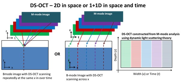 In order to measure this heterogenous nanoporosity, we have developed diffusion-sensitive optical coherence tomography (DS-OCT). For cystic fibrosis, this means we can monitor changes in the mucus mesh during mucus thinning treatments over time. For studying breast cancer, we obtain a 2D cross-sectional view of the extracellular matrix nanoporosity in space. The construction of DS-OCT images is illustrated below in Figure 2.